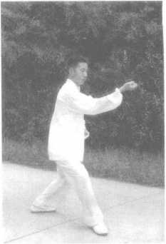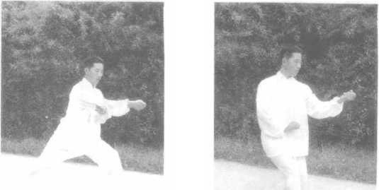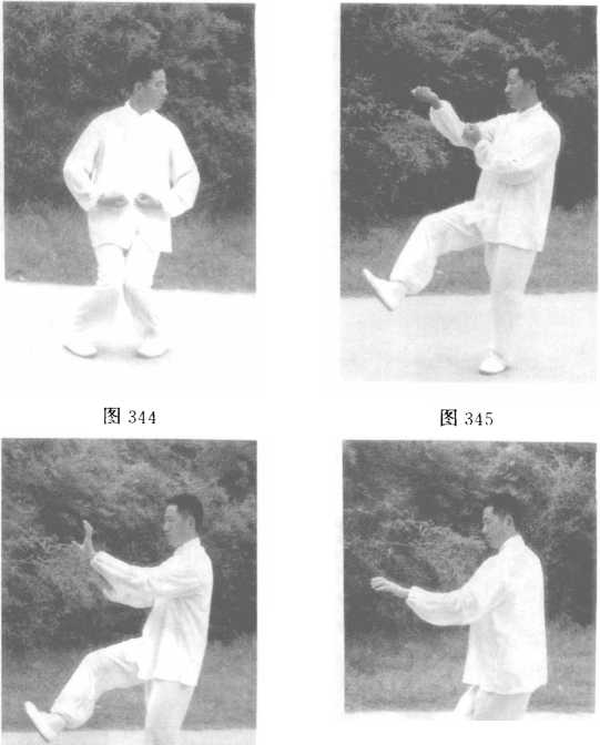 连环拳回身打完后(倒狸猫上树),急进左脚.打右崩拳.如图 348.接下来,把图321至图348重演练一遍,至起点时.回身打出 倒狸猫上树.接着再打右崩拳定式不动。如图349所示.