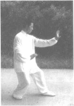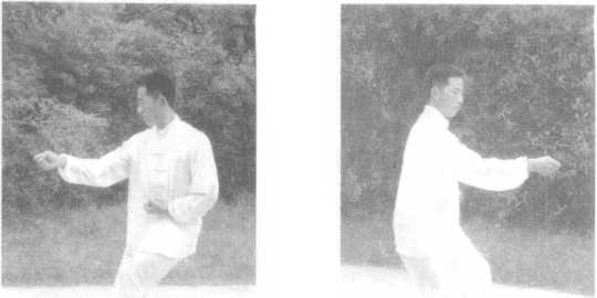 右脚向右后方斜退一大步,左拳穿插右肘下(拳心向下),眼看 右拳食指凸起处。如图35()所示。