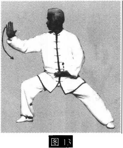 5 .马步立掌:重心继续移向右腿成右偏马步,上 体微右转;右臂横肘向右弧形运至右前侧,坐腕立掌; 左掌下落至左小腹前,掌心向上,指尖向右;眼随视右 掌(图13)(揽扎衣定势)。