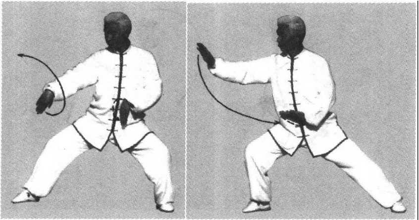 1 .转体伸掌:重心仍在左腿,上体左转;同时,右 掌向左、向前伸举,左掌弧形收于左腹前;眼随视右掌 (图 9)。