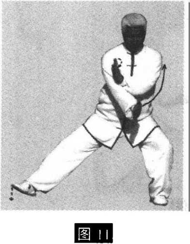 3 .擦步合臂:重心移向左腿并屈膝,右脚提起以 脚跟内侧着地向右擦步;同时,左右臂分别由上下向里 相合,左掌至右腋前,掌心向左,指尖向上;右掌至左腹 前,掌心向右,指尖向前下方;眼随视右掌(图11)0
