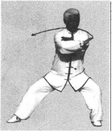 要点说明:①“擦步合臂”分动,当脚提起,两臂上 下似合非合时,稍顿,然后再落脚擦步合臂。在此动作 中,体现手法、身法、步法“开中寓合”“合中寓开”对拉 拔长”的太极拳对立统一的原则。②“揽扎衣”定势,要 虚领顶劲,沉肩垂肘,敛臀坐胯,气沉丹田,周身合住 劲。③意境:东岳古峰,高耸入云,深渊、陡嶂,山风呼 啸;此境演拳,必调集自身胆识、功力、气质与古岳相融 一体。“揽扎衣”本是“逞雄掳袍待势”之意,今练之势, 意有“稳如泰山”“静如山岳”之感,故可称“坐山势”。