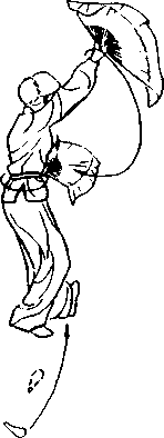 接上式,随右转腰,右手握 扇向下;然后随左转腰向外提至 右额上方翻扇;同时左手握扇屈 肘向里向下,然后随左转腰至左 胯旁手心向下,左脚向右45°略 微蹬脚(图5-50)。