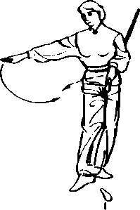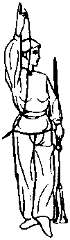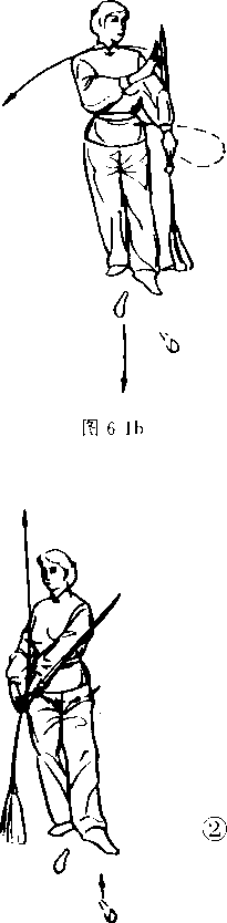③ 随略微左转腰时左脚随右脚挺直 收起,同时右手直指苍天,手心向里,目视 剑锋(图6-2c)0