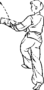 ③左手由右扇下抽出向左上 方挡出至左额上方,目光随左手动 (图 3-16c)o