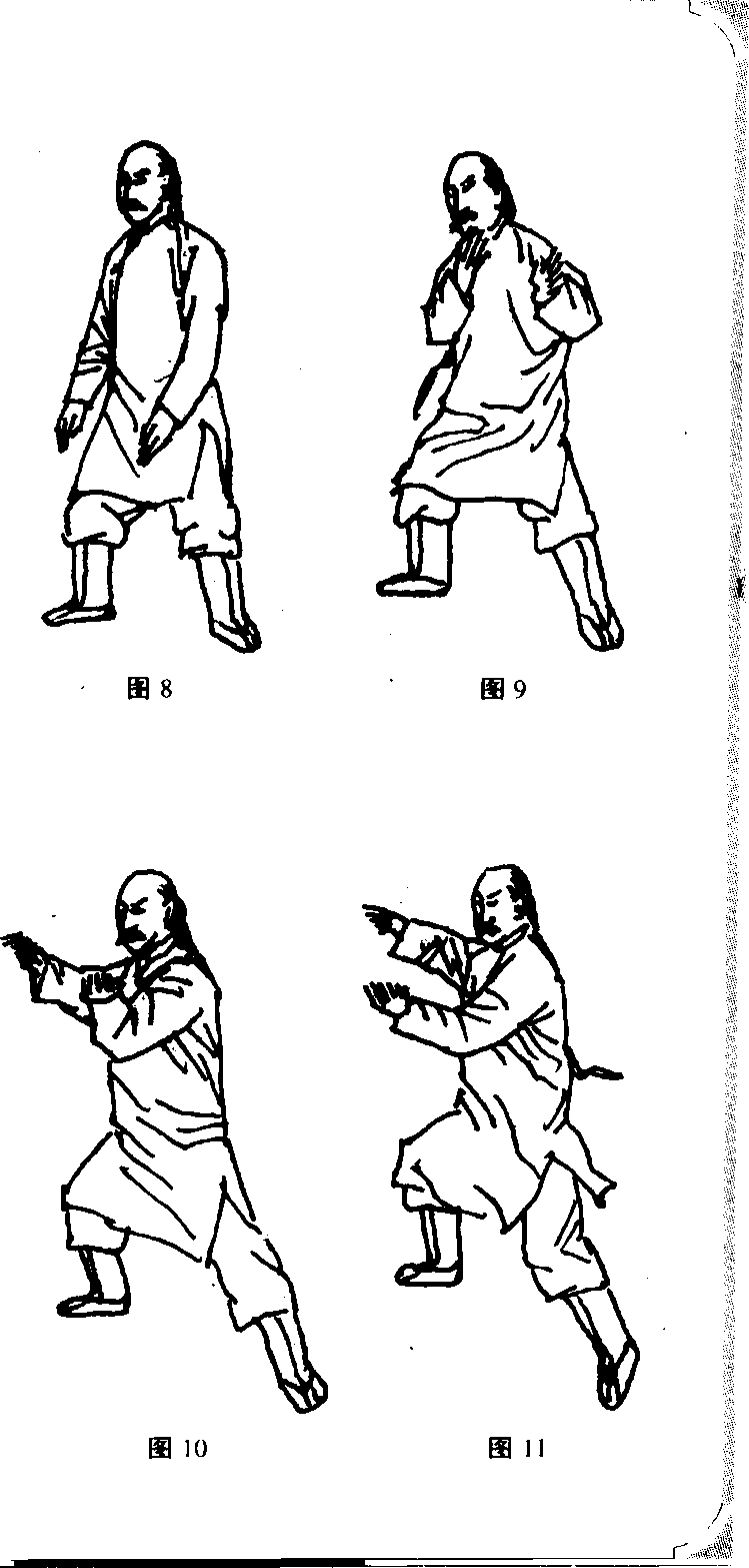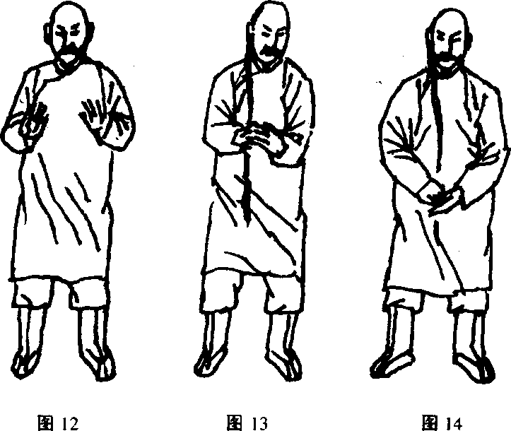 前上步。推按时 两手如立刀 形。推按到位, 两手变仰铲状, 掌心鼓起以助 按劲,此按式 成。随即两手转 化,右手微伸超 左手,即徐徐收 掌变空心拳绕 过左手指回转 下收;左手在右 掌变拳时向外 翻转,微贴右拳 面上,随右拳一 齐.下收,落在肚 挤部位Q左掌在 脐下,右拳在脐 上,约距半寸。 两手收在腹前 时,已上前的右 脚随两手落 地。此时三大对 完成。两手按后 绕圆时,要显示 出点、戳、搬、拦 之势,成式面向 东(图 8~14)。