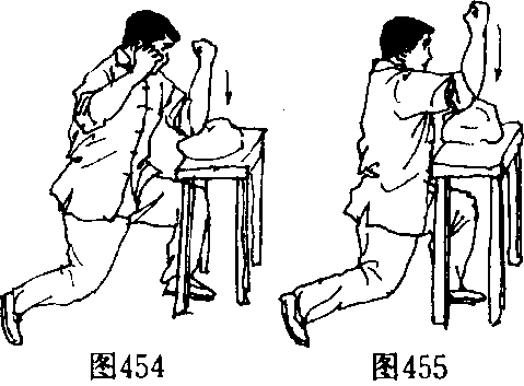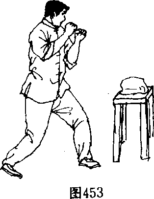 实践者用置于桌子或硬台上的砂袋来练习下击肘技术, 要注意着力部位与肘击劲力的畅达(图453—图455)。