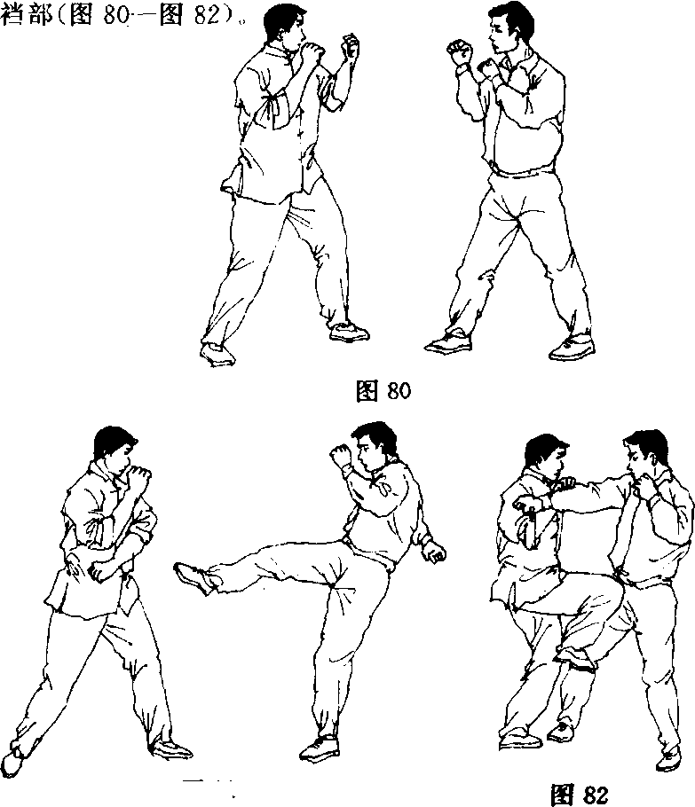【动作说明】实战中,对手前踢攻击时,实践者撤步避开,对手随即直拳猛击,实践者移步同时前手推掌击对手肘部、后膝猛击对手图81【动作要领】撤步要快,移步推掌和后膝猛击的动作要一气呵成°