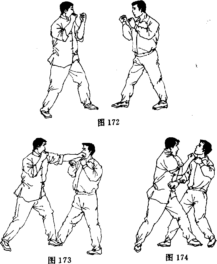 实战中,实践者移步前拳猛击对手面部,随即前手回手控 制对手前臂,同时后手勾拳击打对手下颌(图172—图174)。