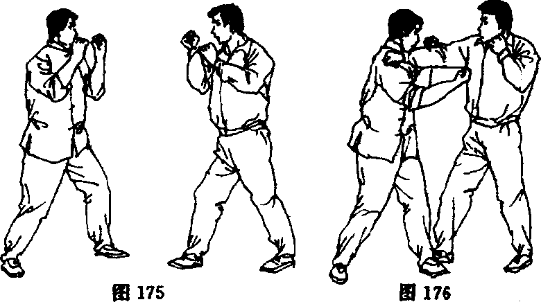 实战中,对手前手直拳攻击时,实践者移步前手轻推对手 前肘部,同时后手勾拳猛击对手肋部(图175、图176)。