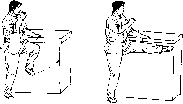 实践者可扶按物体,做提膝前踢的重复练习。在此练习 中,实践者是为掌握正确技术动作,所以应放松,缓慢动作,然 后再逐步提高运动速度及其它要求(图244、图245)。