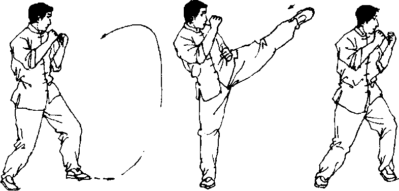 由警戒桩势开始,前脚前滑约7?8厘米,后脚随即滑进, 前脚做扫踢动作。扫踢除在目标附近有小弧度路线外,其出收 均为直线(图385—图387)。