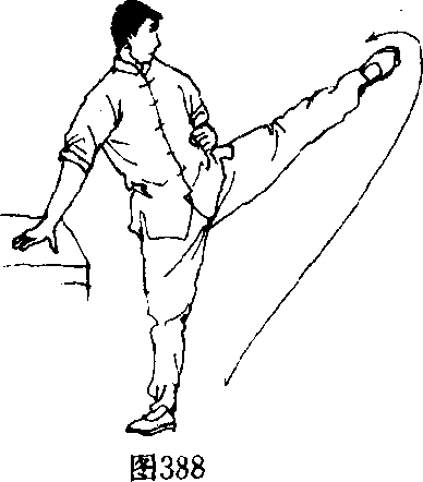 实践者练习扫踢时,可以扶按物体,缓慢动作以体会扫踢