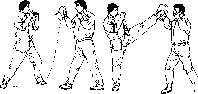 助手持靶与面同高,实践者向脚靶做扫踢动作。练习时. 战者要注意踢击距离、路线等。可以由静止中开始动作,逐 更成在移动中完成动作(图389、图390)o