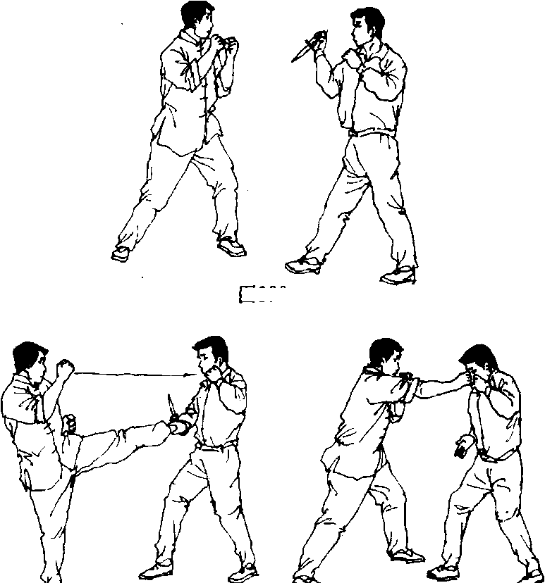 【动作说明】在抗暴自卫中,扫踢亦可发挥作用。暴徒持刀欲动时,我突然移步扫踢暴徒持刀手,其持刀手 被踢开或刀被踢掉时,我当即移步挥拳猛击对手面部(图 399—图 401 )o图399图400图401图399图400图401【动作要领】这对扫踢的准确性和速度要求较高,面对暴徒持刀行凶 时,一定要冷静行事,一旦时机成熟就毫不犹豫地果断动作。在对付暴徒时,必须记住,决不可对暴徒心慈手软,若给 其留喘息机会,否则后果不堪设想。