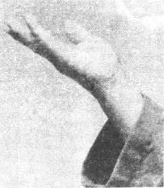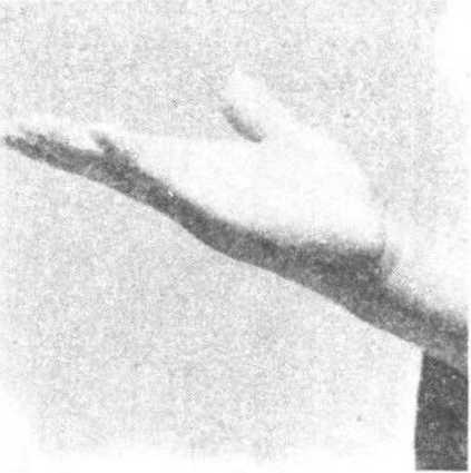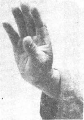 阳八字手:拇指、食指伸直展开成八字状,其余三指 略蜷屈,手心朝下。(见阳八字手图)