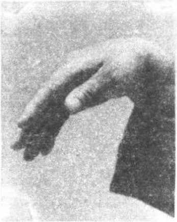 勾手:屈腕,拇指、食指、中指指尖轻轻捏拢,无名 指与小指微屈下垂。(见勾手图)