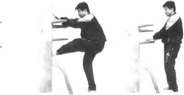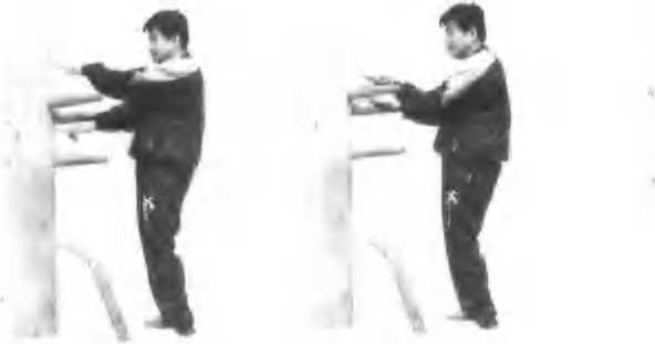 依上势h左按掌变N字拳猛击向木桩面部(见图109) 110.连环冲拳
