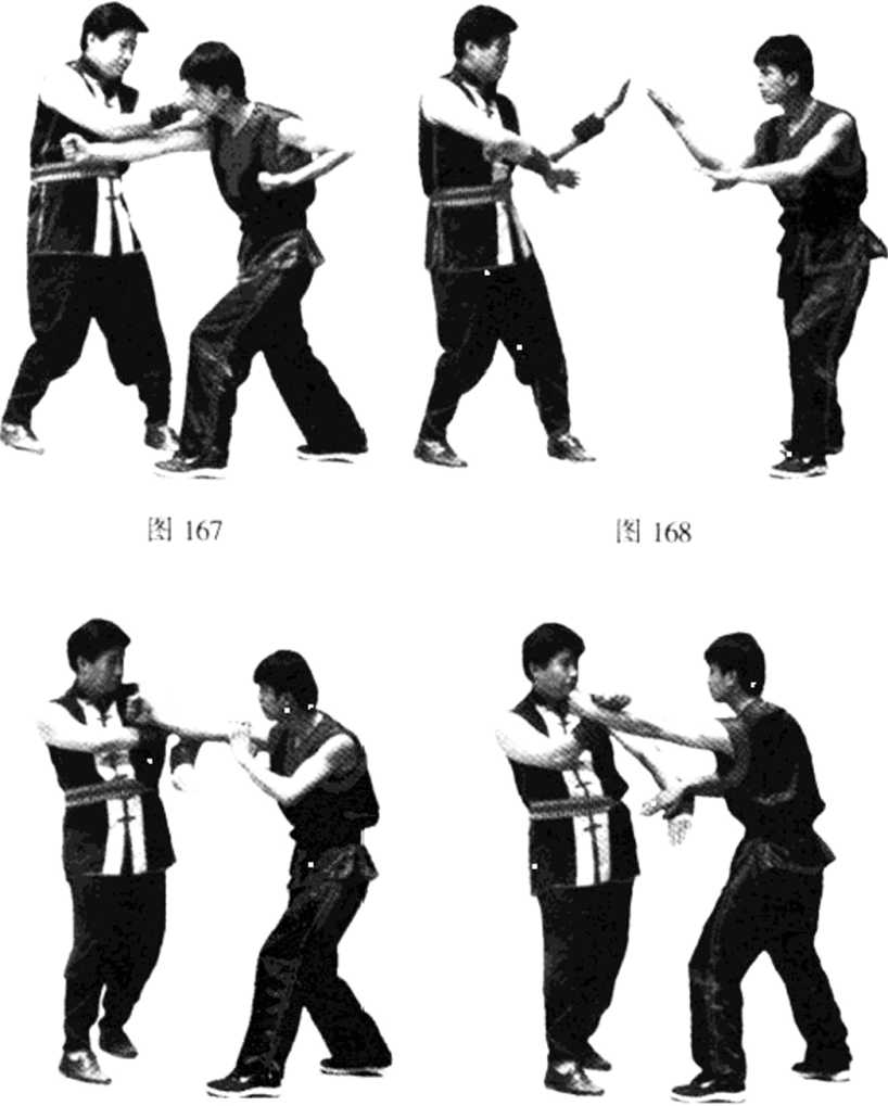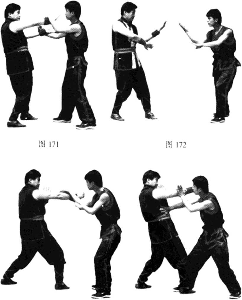 【例9】摊标f?转伏手打3双方对峙准备格斗(见图 178〉;甲方以右直拳向乙方中路攻击,乙方即以左摊手在内 帘摊住甲方的右冲拳,同时以右标指手攻击甲方的喉部(见 图179);打甲方喉部的右标指可手顺势向下伏按,然后乙方图176 图177迅速坐偏身马以左直拳猛打甲方的脸部(见图180)。
