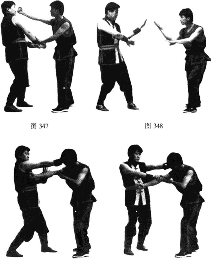 双方对峙准备格斗(见图 348);乙方用右直拳向甲方上路进攻,甲方即向左移步以左 横拍掌拦截,并用右直拳打乙方的脸部(见图349);当甲 方右拳打在乙方脸部时,立即变爪手下抓乙方的右冲拳,并 接着再出左直拳攻击乙方的脸部(见图350);当甲方左拳 猛打乙方脸部时,为防乙方左拳反击,甲方左手即化弯弓射 箭手封乙方的双肩或侧门;右箭拳打在乙方的腹部或肋部 (见图351)。