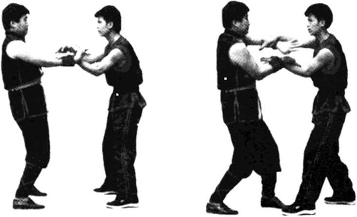 【例1】双黏手中的掌法。双方呈双黏手势(见图559); 甲方突然将左桥手膀起,右手立即变耕手(见图560);甲 方突然打出双掌,即以左上掌、右下掌地直打乙方的中门 (见图561)。