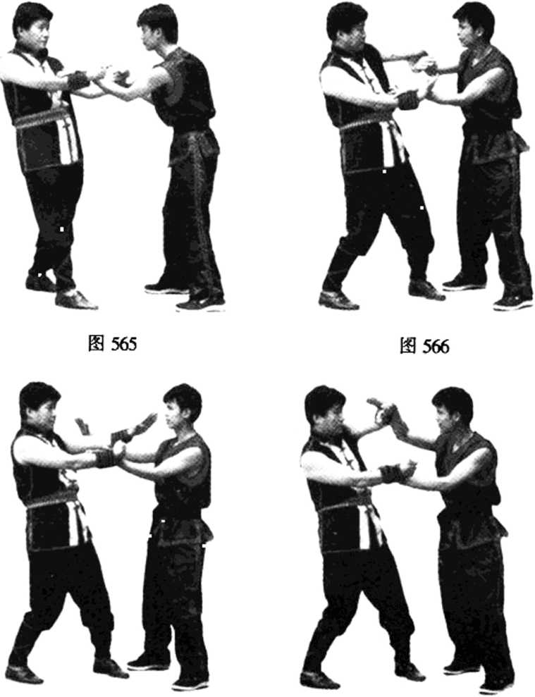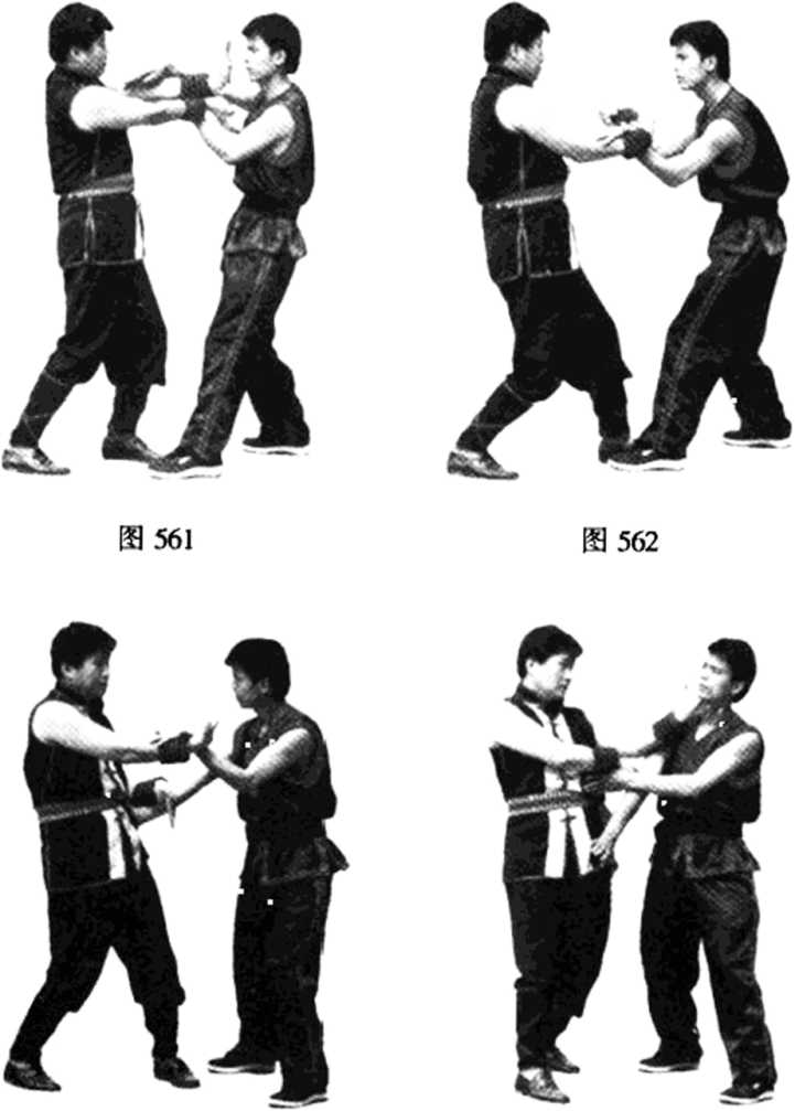 【例2】偷漏打化右割左托掌。双方呈双黏手势(见图 562)。乙方右桥手突然下漏打击甲方的肋部,甲方左手即下 沉成闩拦掌封住乙方右掌的进攻(见图563);这时甲方身 体突然右转,右手割住乙方左手不放,左手即化掌上托乙方 的下巴(见图564)。