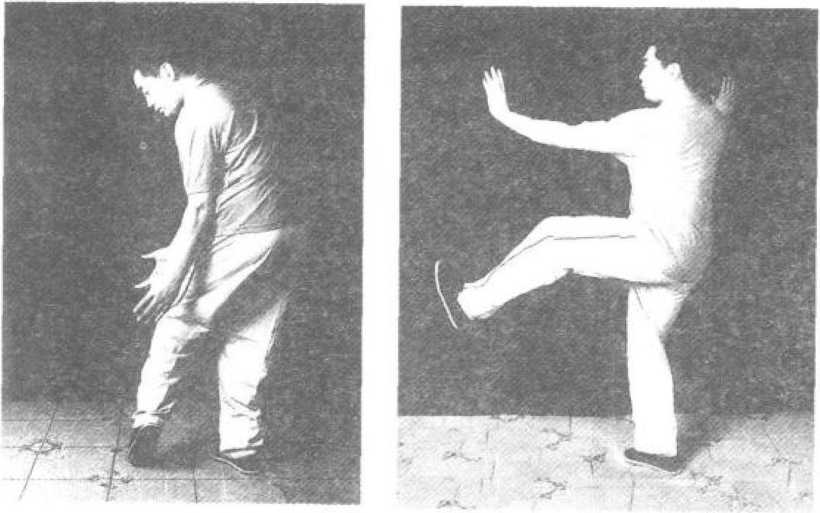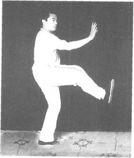 接上式,双臂不动,左脚跟划弧至右膝处并后蹬 落地,重心移至左腿。扣右足,重心移至右腿,双足 成丁字型,下身不动,上身左转180°,松右腿,双臂 下落至左膝弯处如抱物状(图61)。左膝随双手上提 至腰际,分掌蹬脚(图62)。