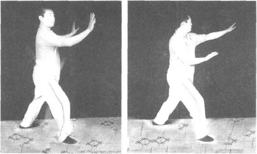 膝,右掌向前推出(图59)。双臂下落如抱物状,左 掌从右掌上方向前捋出。坐腰、吸胯,重心移至左 腿,同时左掌回收至右肩处。弓右膝,重心前移,左 掌从右臂上方向前撑掌指出(图60)。