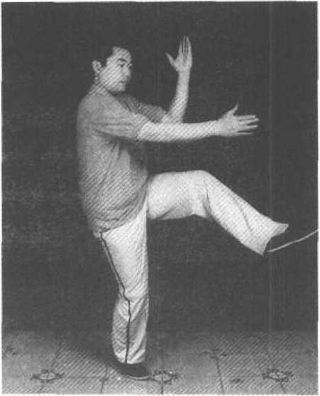 接上式,左足前弹,右掌四指前点,如公鸡点头 一般(图99)。