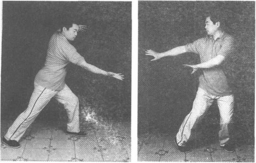 接上式,左足回收至右膝处,向斜后方蹬出落 地,同时左掌变仰掌顺着右臂的外侧向前穿出,右臂 吸肩、吸肘向斜后方甩出。左臂不动,右掌顺着左臂