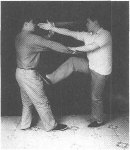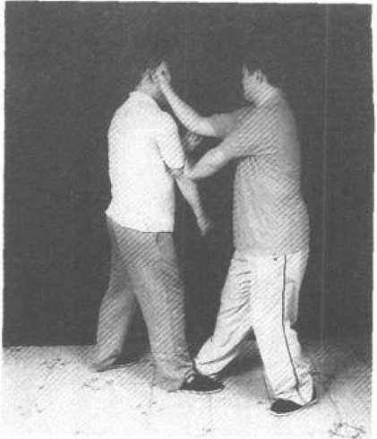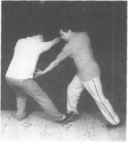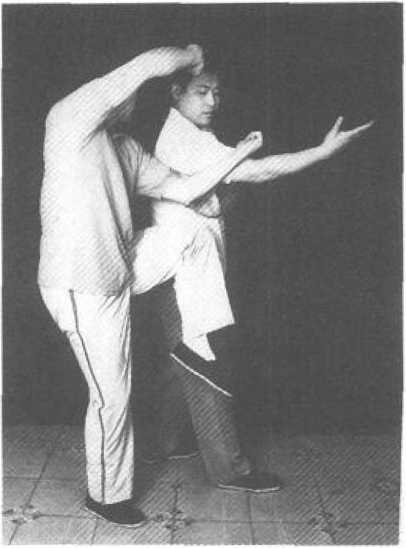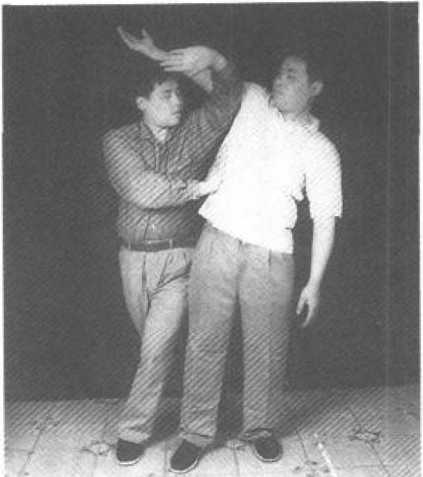 当甲出右拳打击乙胸、腹部时,乙含胸收腹化开图150来势,以左手按甲右臂,随即穿右掌、起右腿分别点 击甲的面部和阴部(图151)o18.翻背捶:当乙出手击打甲的面部或胸部时,甲闪身上右步 避开其锋,随即左转180°,左臂、右拳和左膝一起击 打对方(图152)o图15219. 弯弓射虎:在搏斗中,甲用右手抓住乙右臂后带,随即上右 弓步出左手穿击乙的阴部(图153)。20. 上步盖捶:当乙打击甲的腹部时,甲向乙的右侧上步以左手按乙右臂,然后上右步出右拳盖击乙的右太阳穴(图154) o图153