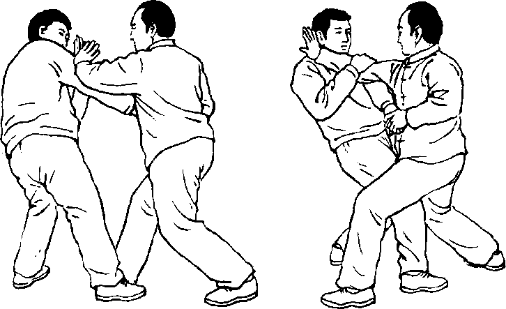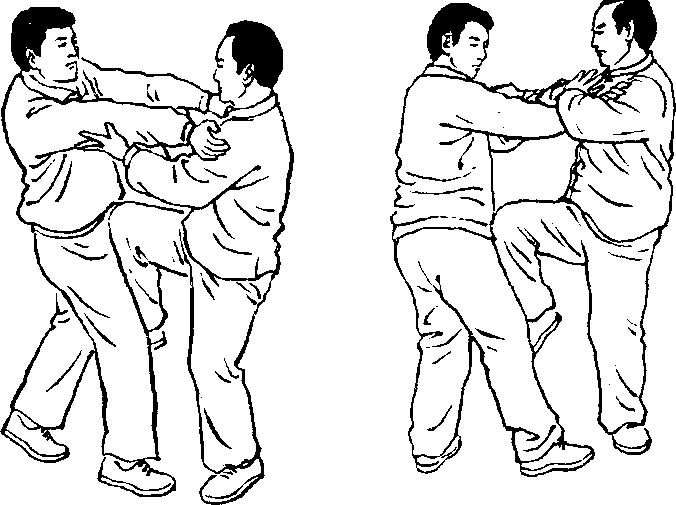 此式是一种摔法。全式分作三段,含有三种摔法。第一段,即 动作、二、三,是左腿插裆,双手向右外援,左腿逆缠外崩,将敌人 摔向我右前方;第二段、第三段即动作四中所包括的两种摔法。先 是左腿外套敌右腿向里勾扣,双掌向左前击其胸或臂,右膝提起撞 击其裆腹部,向左前方摔之,为第二种摔法。然后,我右腿再偷进到 敌身右侧,再走右外摆脚,同时双手向左侧击打敌上盘,上下形成 剪刀劲,将敌摔向我前方。此为第三种摔法。此式充分体现一式之 多用,读者不可不仔细钻研。