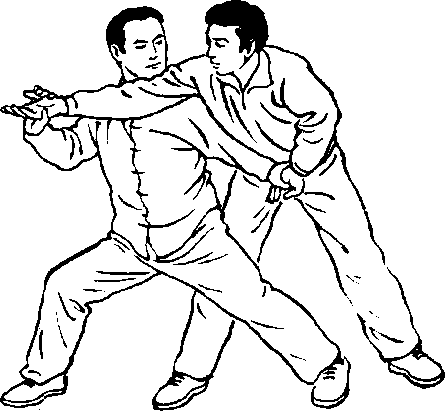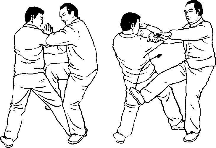 设敌在我正面进右步,用双手抓住我双臂肘弯,欲将我推出跌 倒在地。我即乘敌人双手劲将发未发之际,身快速向左转约90% 同时双手逆缠以制劲分敌双手推我之劲,使敌身左转歪斜。同时我 右手逆缠向敌胸部击去,并右膝逆缠里转,向前上再提,向敌裆内 撞击,将敌击伤。我左腿站稳以控制重心,这样右掌与右膝上下同 时向敌进攻。(图252)