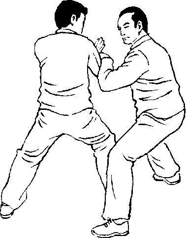 接上动作建我存手管住敌右肘外侧,右手攒住敌右腕关节,顺 势向右外下搬采敌右臂F,使敌身前倾失势。同时左腿逆缠亚转, 用左小腿外翻之势,弹崩敌人右腿,形成上攘下崩之势,使敌前伏, 乂是一种摔法。