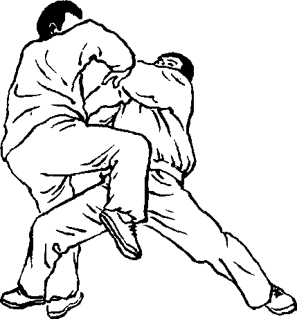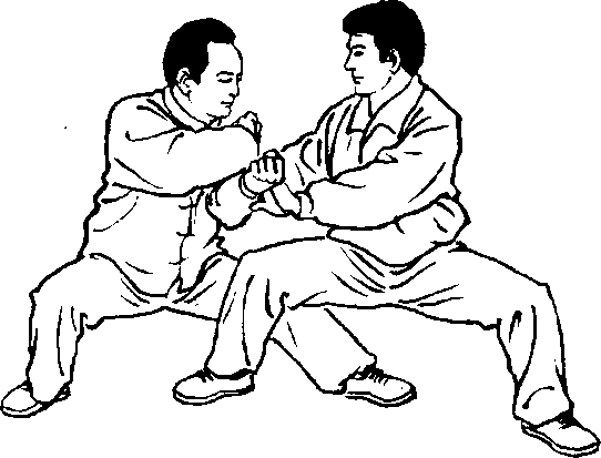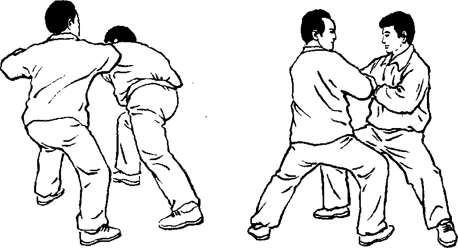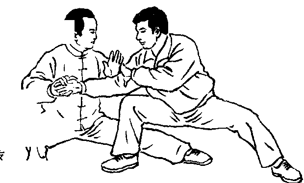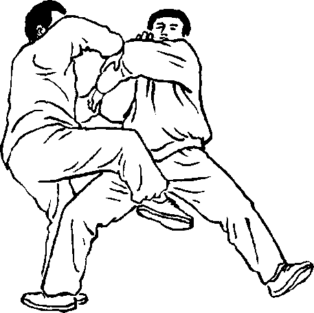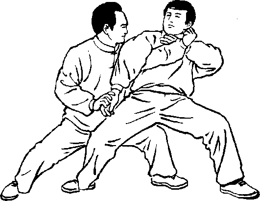 设另一敌人在我右侧前,用双手按住我右臂肘,准备施按劲将 我向左后方推出。我即乘势身向左转约90。上升,重心在左。右腿 逆缠屈膝上提,可撞击敌裆部、腹部。同时左手合于右肘处,以双逆 缠向左上耨敌人双手肘臂搠起,使敌人胸前露出空间,以备进攻。