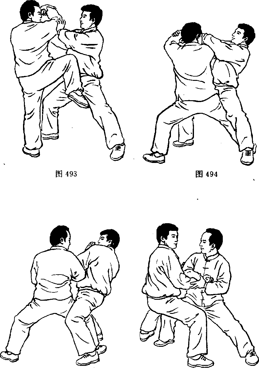 左拳先逆缠略向左外上扬(使敌人判断错误,这是欲下先上之意), 再顺缠里合下沉至两膝前下,使敌人按劲落空,身前倾失势。同时 右拳由右腿外侧先顺缠变逆缠向右膝外侧配合引进。(图488)