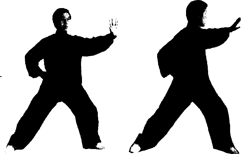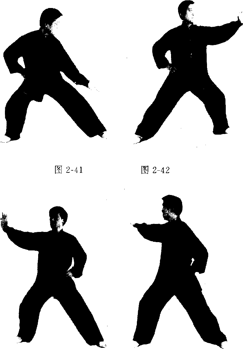 动作四:身体略左转,左手逆缠上搠至左膝 上方(图2-42)。一开一合为1拍,共练两个8 拍。再换右手练习,动作要领相同,唯左右互换 (图 2-43、2-44、2-45、2-46)。