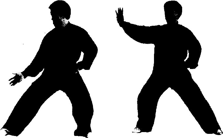 动作三:身体右转,重心移至右腿,左手顺 缠里合于左膝上方,眼顺左手看左前下方(图2- 41)。