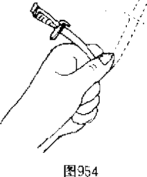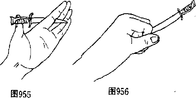 1. 以食指和拇指微屈相互轻轻对捏住刀尖或刀柄,刀刃 朝前「其余三指向掌心屈卷或自然伸展(图954).往前抛掷 时'迅速屈腕、松捏撤开飞刀,使之向前在空中翻转,以刀尖定 着于目标“