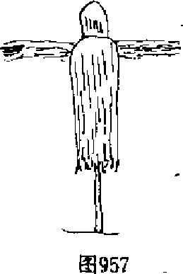 练习飞刀,先取稻草或杂草扎制成一“十”字状人标靶(图 957),也可以取木板一块,用墨笔绘出人头的耳、目、鼻、口,以 及胸腹躯干和四肢。由距离草人或木板2米处开始定点定位 练习,每日早、中、晚3次练习发放,每次发放的数量可根据自 身的时间、环境等情况来确定,每练习完一月后,后退。?5米, 直至距靶5?6米定位距离而刀无虚发时,则大功告成,飞刀 的运行路线因为是一弧形抛物线'用的离心力,所以掷力敢准 点时,应高于标靶数寸,才可以击中目标.须注意的是距靶越 远,出手时的刀头和手臂越高。