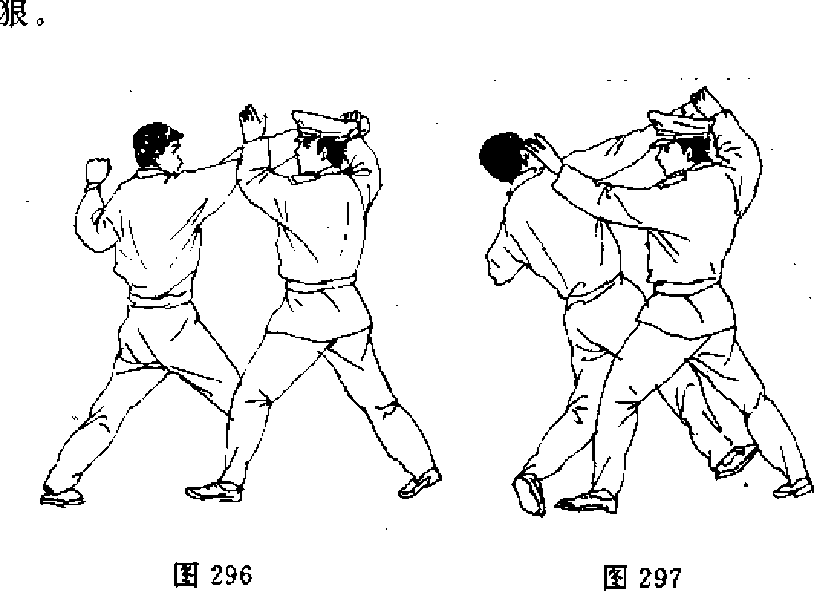 【动作说明】当敌左拿虚晃,突用右拳向我面部击来时, 我速用右手挡抓住敌右腕部,然后速用左掌砍击敌右肘曲池 穴(图296)*紧接着再用左掌砍劈敌右太阳穴(图297),