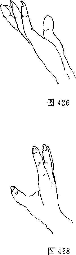 (一)步型前三七步(图424),后三七步(图425),(二)手型逆手掌(图426),穿梭掌(图427),荷叶掌〔图428),迅雷 掌(图429),尖拳(图430),劈掌(图431)。图427图427图427图427图43。 图431