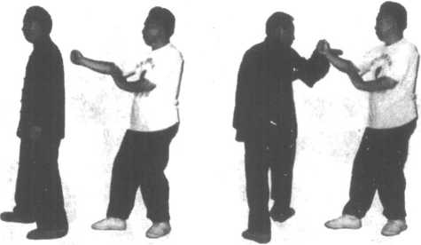 翻身反臂撤拳左击掌甲从背后偷袭,上右步出右拳击乙后背部,乙向右后转 身,右脚开步,脚尖外撇,同时右拳反臂砸击甲右拳。甲快 速向下滑劈右拳,乙则以右臂贴扶紧随,同时继续右转身并 上左步出左掌穿击甲喉部。(图4- 136- 138)图 4-136 图 4- 137图 4 - 138