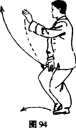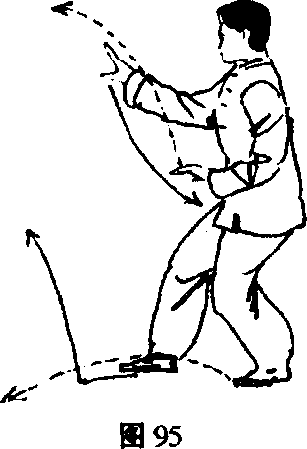 (1)右脚向前进半步,同时右掌由左掌下面向前伸出, 高与眼平;左手撤至腹前,两手手心均向下。目视右手。 (图 95)
