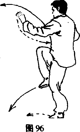 (2) 左脚向前迈进一步,落脚后不停,继续用左脚蹬地 尽力向前跳一步,同时右脚屈膝提起;在跳步的同时,左掌 顺着右手上面向前、向上伸出扑击,高与眼平;右手撤至腹 前,两手手心均向下。目视左手。(图96)