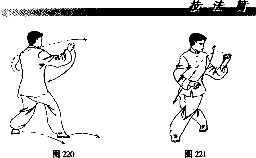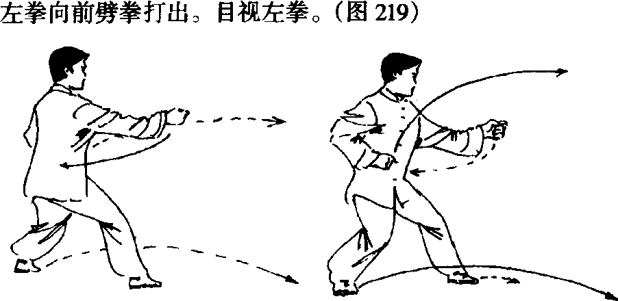 右脚向前迈进一步,左脚随之跟步,身体左转。左拳向 内收回,置于腹前,拳心向下;右拳外旋,从胸口处向前钻 拳钻出,拳心向上,高与胸齐。目视右拳。(图220)