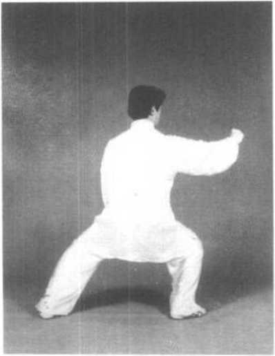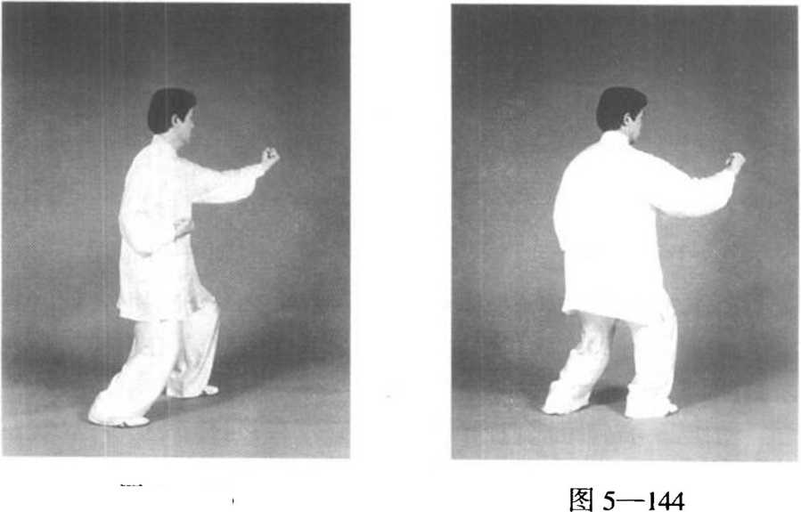 动作三:松左胯,身体左转, 右膝里合,脚尖内扣,重心右移。 随着转身,左拳向下松沉收回,右 拳向前击出;同时左脚弧形后退 半步,脚跟顿地有声,以配合右拳 的前发劲。重心在右脚。目视前 方,耳听身后(图5—144)。