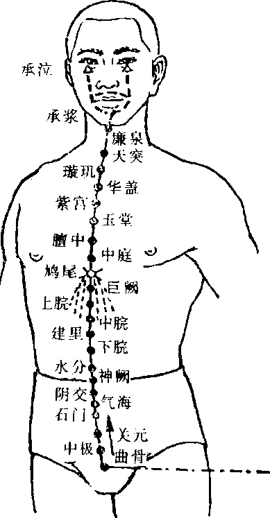 《素问?骨空论》:任脉者,起于中极之下,以上毛际,循腹 里,上关元,至咽喉,上颐循面入目。《灵枢?五音五味》:冲脉、任脉皆起于胞中,上循背里,为? 666 ?经络之海;其浮而外者,循腹(右)」二行,会于咽喉,别而络唇《灵枢?经脉》:任脉之别,名日尾翳,下鸠尾,散于腹(如图 8—22)O图 8—22图 8—22图 8—22图 8—22