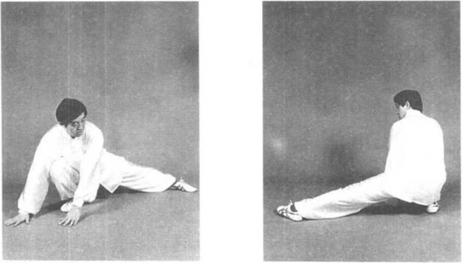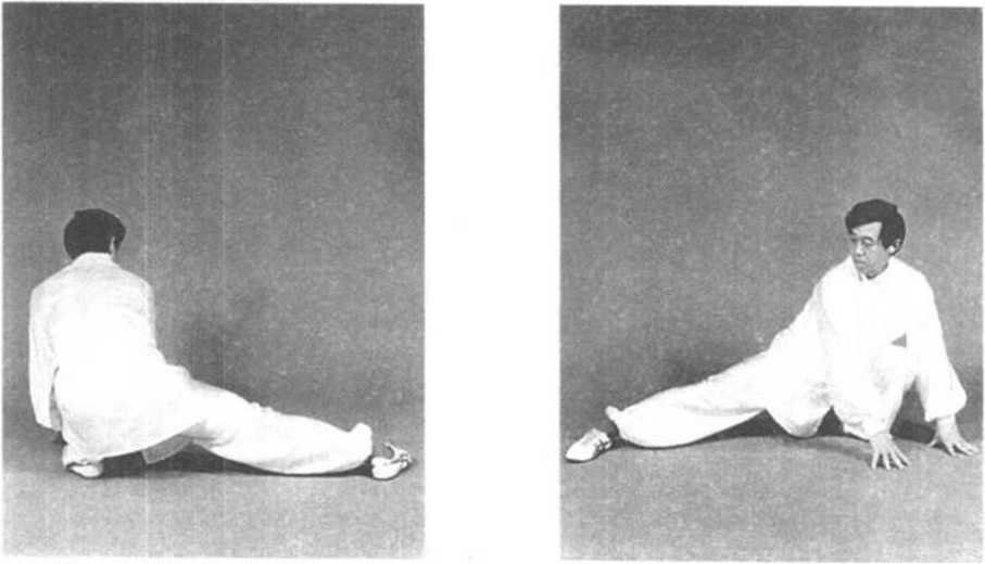 动作一:接上势,身体迅速向右俯身,重心移于右足,两手变 掌,两掌随身体右转在右足前按地。右腿全蹲,左腿伸开向右扫半 圈。目视左足(图3—127、图3—128)。