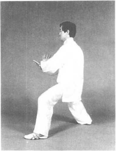 动作二:接上势,身体继续右转,重心移至左足,左腿屈蹲。右 腿伸开向后扫半圈。目视右方(图3—129、图3—130)。